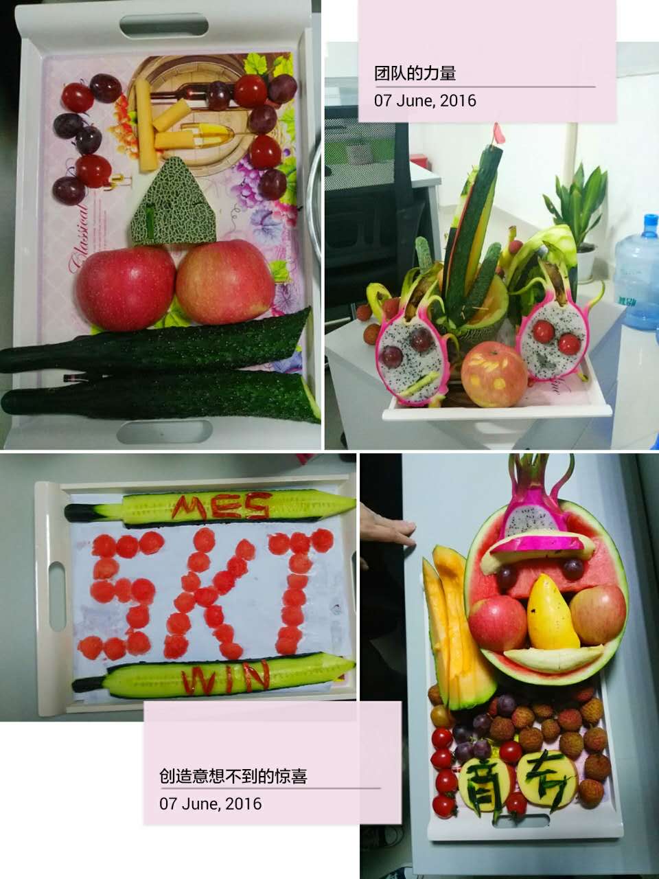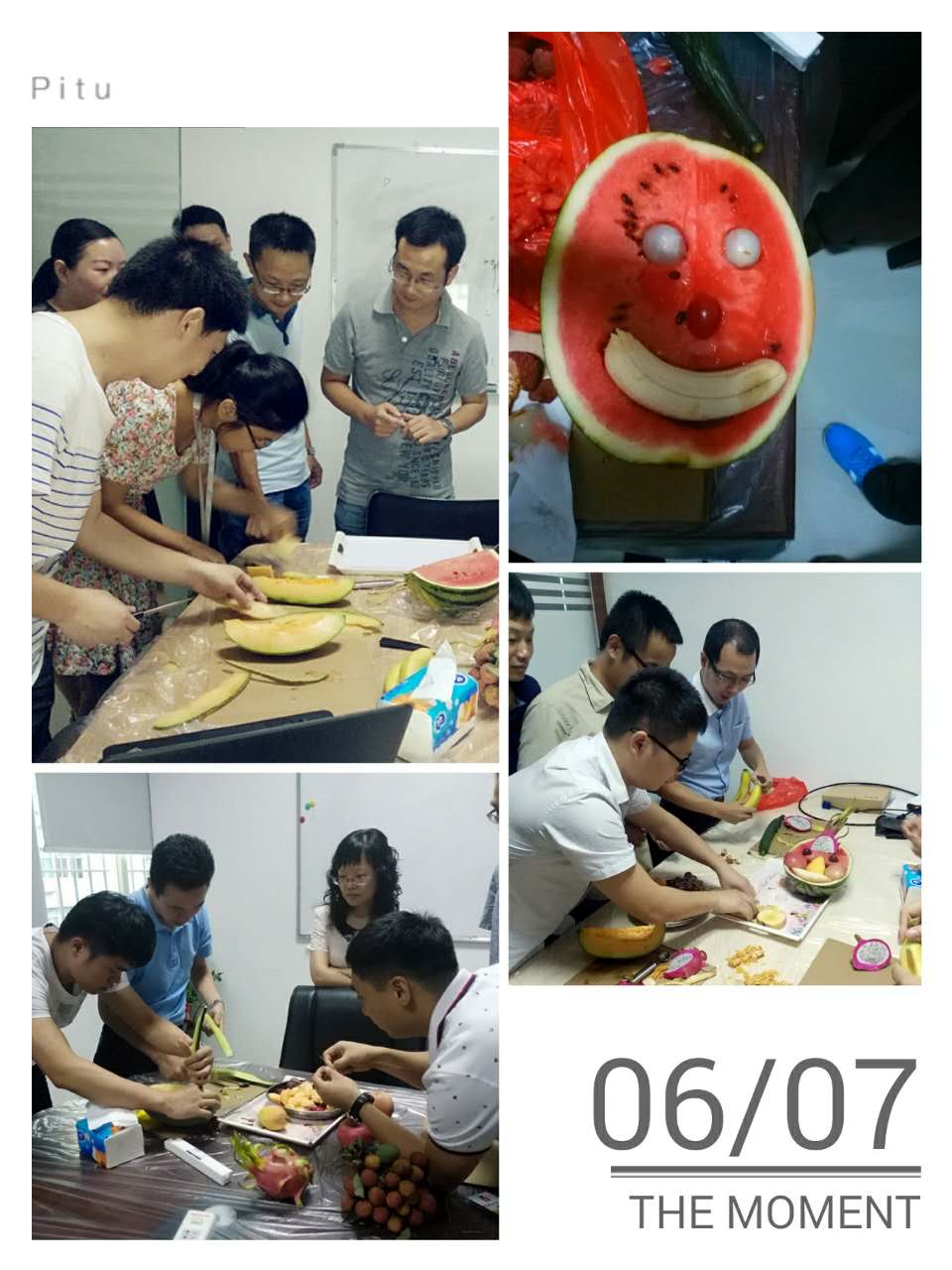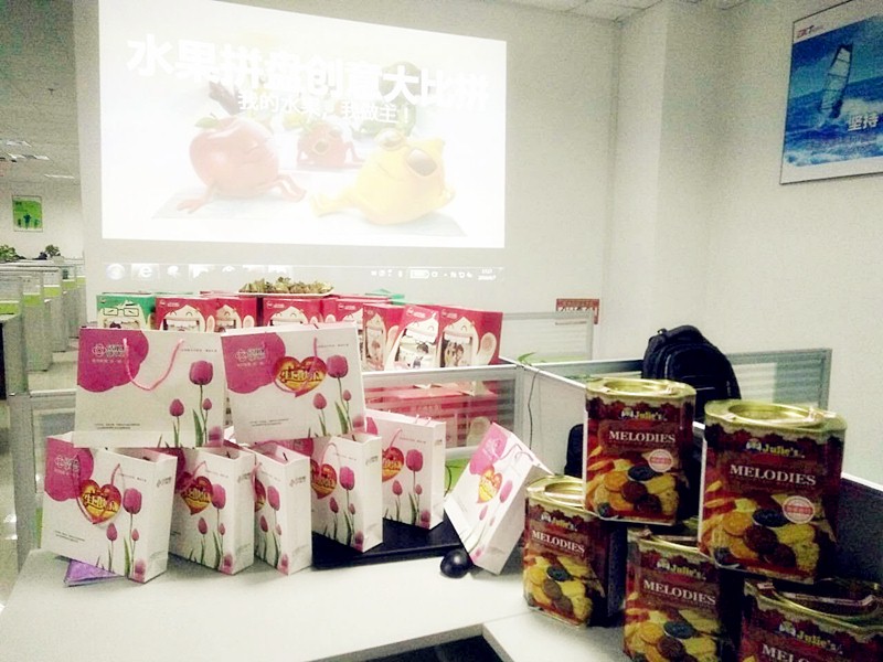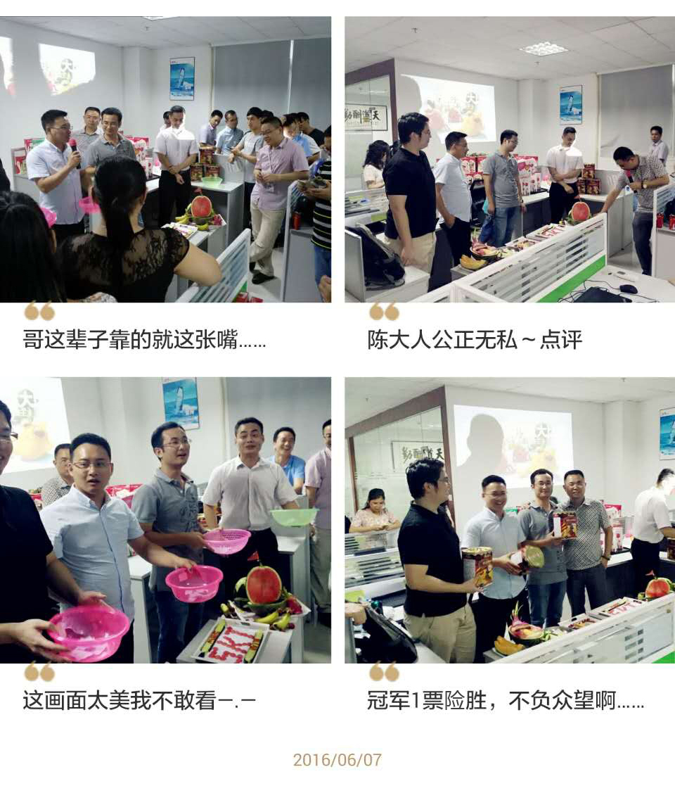 ?全員會(huì)議結(jié)束后,介于深圳略顯炎熱躁動(dòng)的天氣,公司決定給大家來(lái)一場(chǎng)“水果降溫”措施,舉辦一次輕松有趣的水果創(chuàng)意拼盤(pán)大賽,目的讓參與隊(duì)員在集體活動(dòng)中培養(yǎng)起分工協(xié)作、相互配合的默契與集思廣益的團(tuán)隊(duì)精神。平日思想火花碰撞的辦公室,在公司行政美女的精心部署下,被布置成別致的活動(dòng)場(chǎng)地,努力裝點(diǎn)的背影后,是一場(chǎng)待啟的歡樂(lè)Party。